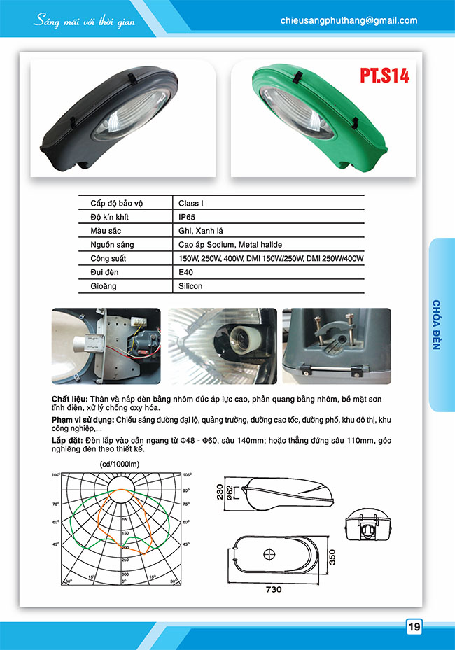 Chóa đèn PT.S14 được thiết kế bằng nhôm đúc áp lực cao, chóa có thể chịu được nhứng tác động không tốt của thời tiết, bảo vệ đèn bền bỉ với thời gian.