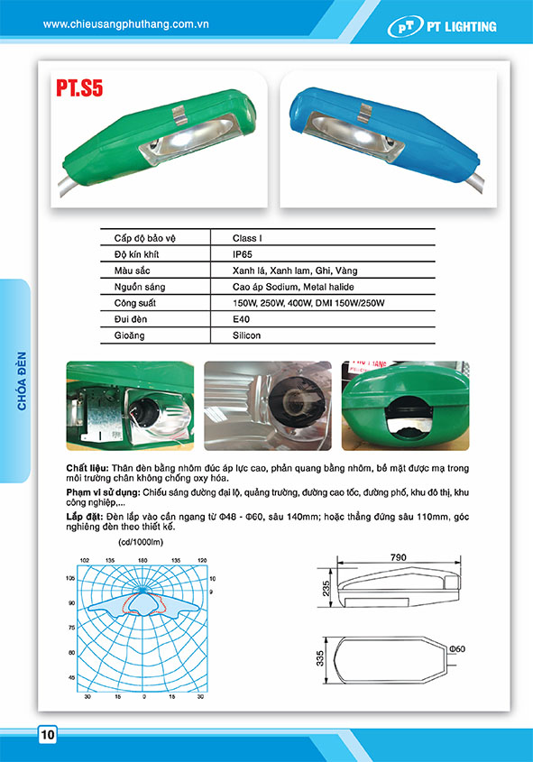 Chóa đèn PT.S5 có đến 4 màu sắc cho bạn lựa chọn: xanh lá, xanh lam, ghi, vàng. lắp đặt chóa cũng không phải đơn giản. Chọn chóa có chất lượng chưa đủ, chóa phải có màu sắc phù hợp với cảnh quan đô thị, làm tăng tính thẩm mỹ cho khu đô thị