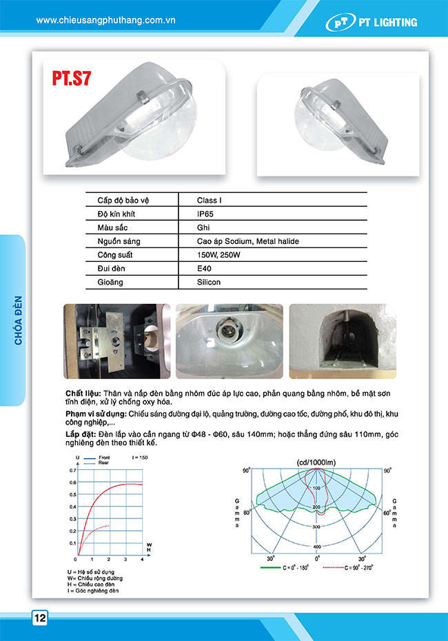 Chóa đèn PT.S7 có công suất từ 150 - 250W, cho phạm vi chiếu sáng rộng do đó ở những nơi có diện tích rộng như khu đô thị, khu công nghiệp, quảng trường,... chóa đèn được sử dụng rất phổ biến.